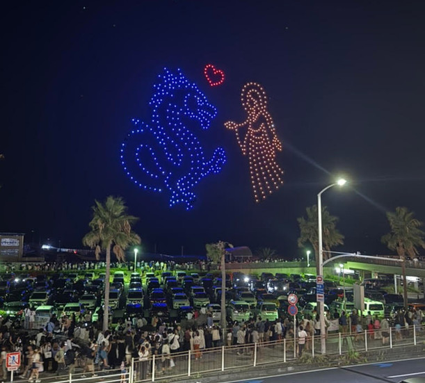 本ドローンショーは、毎年100万人を超える来場者が訪れる日本有数の海水浴場「片瀬西浜・鵠沼海水浴場」で開催された「江の島マイアミビーチショー“夏”花火」のオープニングイベントとして実施されました。今年は、江の島に伝わる「天女と五頭龍」の伝説をテーマにしたストーリー構成が初めて導入されました。